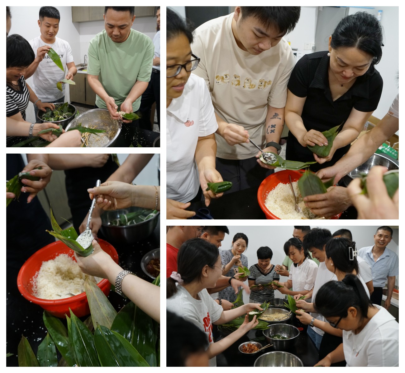活動(dòng)伊始,主持人一聲令下,活動(dòng)全員組成“粽志成城”、“萬粽矚目”、“不負(fù)粽望”、“紅?!彼男?/span>隊(duì)參與趣味比拼小活動(dòng),各位選手摩拳擦掌、躍躍欲試。在包粽子體驗(yàn)中,大家認(rèn)真的卷起粽葉,填入糯米,加入餡料,再合上粽葉用粽線纏繞綁緊,整個(gè)過程一氣呵成,不一會(huì)兒滿滿的、各種各樣的、一籃籃粽子就呈現(xiàn)在眼前。大家歡聲笑語,時(shí)而交流粽葉怎么卷,時(shí)而討論怎么綁得緊,天祥“一家親”的和諧氛圍彌漫全場(chǎng)。